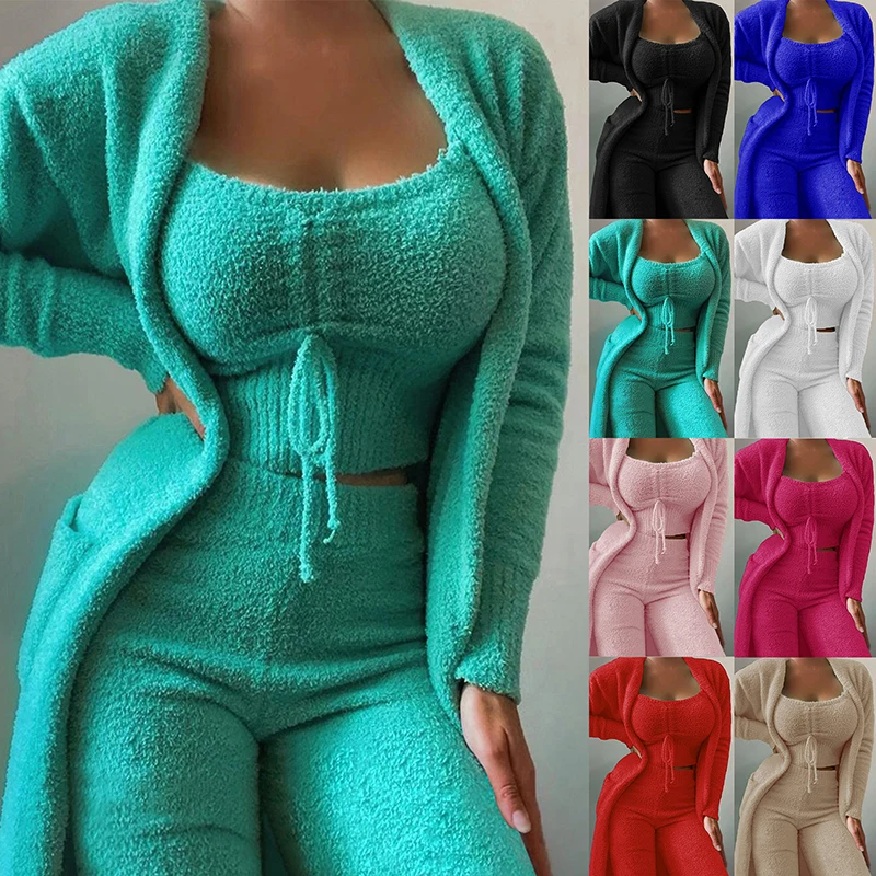 2023 New Autumn Winter Women's Velvet Pajamas Set Crop Top Long Pants Coat 3 Pieces Suit Warm Soft Fleece Homewear Pyjamas