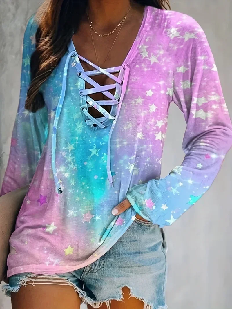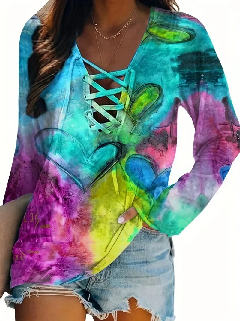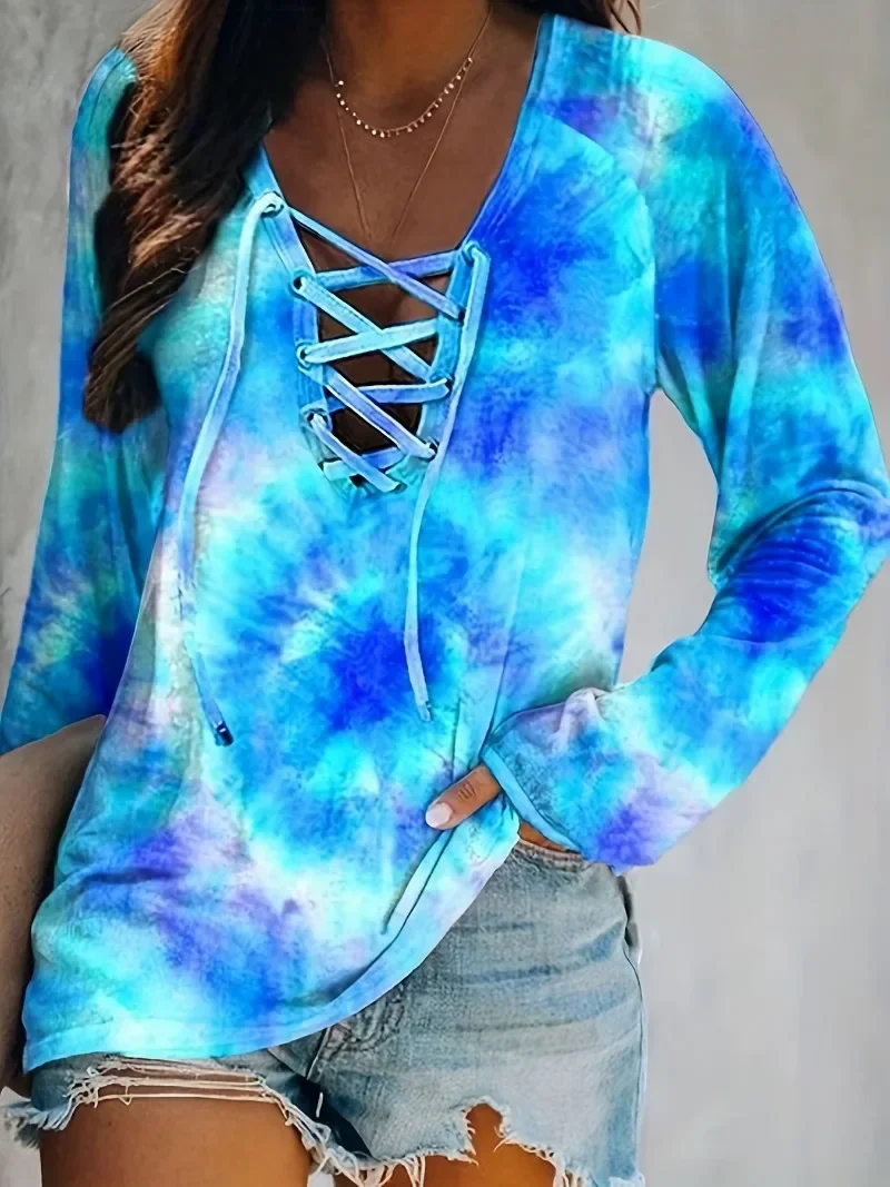 Fashion Women's Plus Size 1XL-5XL New Tie Dye Long Sleeve Strap V-Neck T-shirt Ladies Casual Loose Tops
