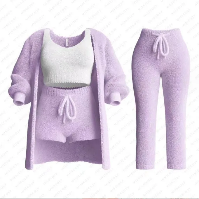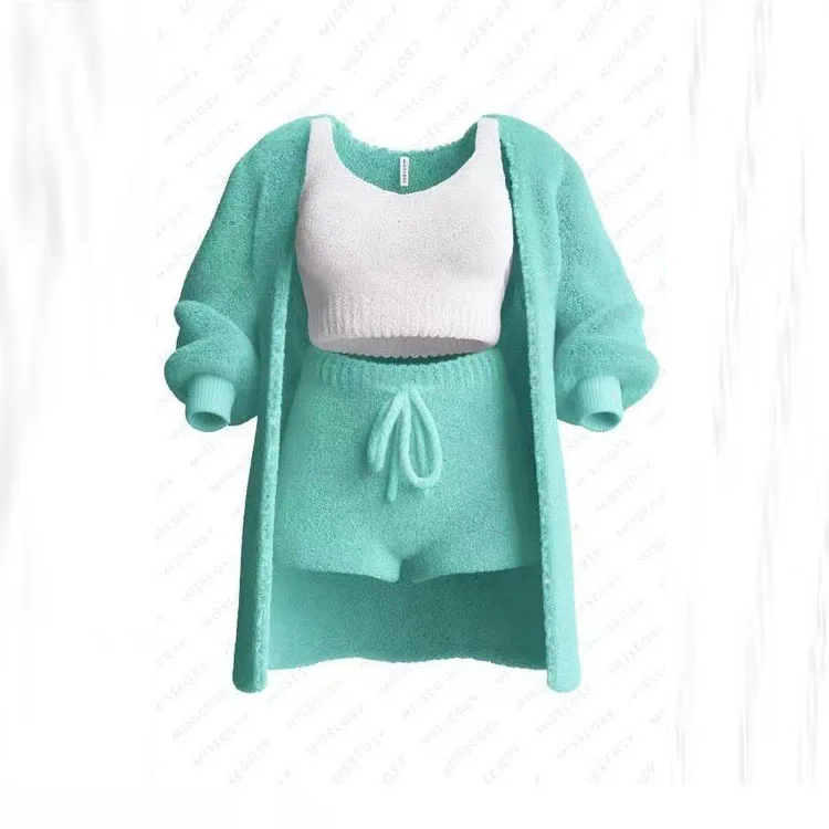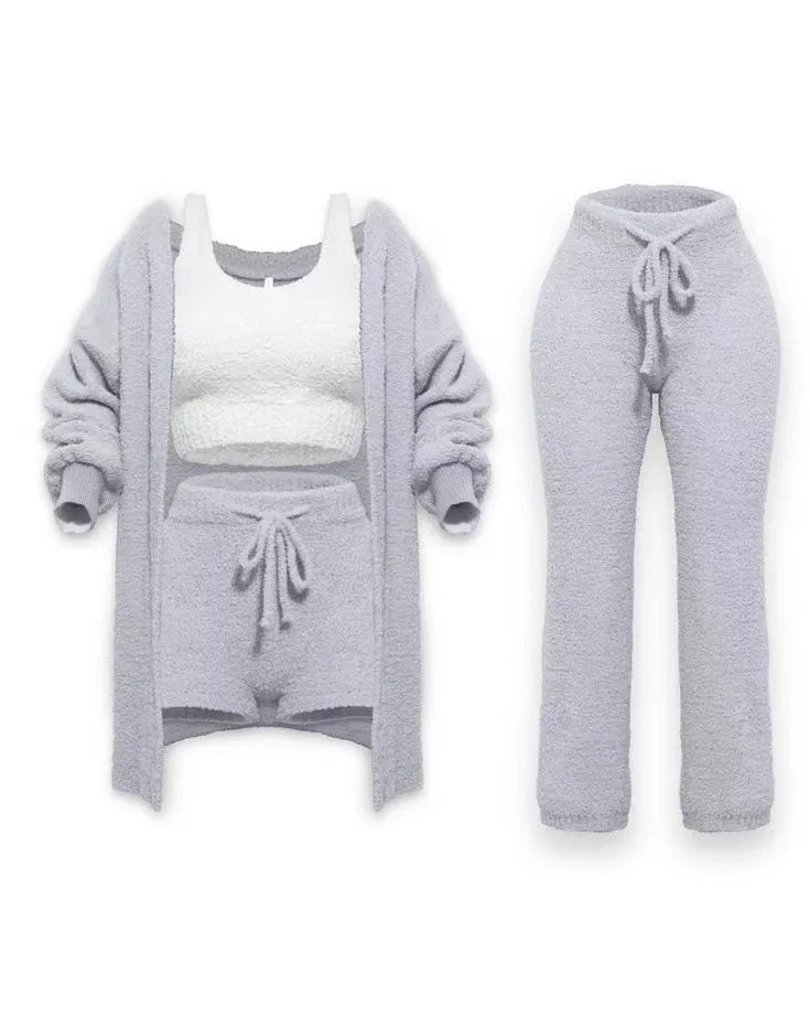 Womens Fuzzy 3 Piec 3 Pe Outfits O Neck Cropped Tank Tops Long Sleeve Fleece Warm Hooded Cardigan Shorts Set Loungewear